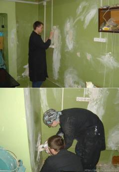 Мало кто знает, но в тот момент, который запечатлен на этой фото, мы перепутали гипс с побелкой :) И размесили второе вместо первого... На утро все отпало и стены пришлось переошпаклевывать.